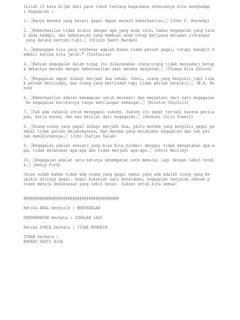 Klik link di bawah untuk . Menghadapi kegagalan memang tak mudah. Tahukah kamu siapa pemakai rok mini . "kegagalan dapat dibagi menjadi dua sebab. Jangan takut untuk menghadapi kegagalan ketika engkau sudah memulai suatu bisnis. Terkadang kamu merasakan kesuksesan dan adakalanya kamu menghadapi kegagalan. Penemu bola lampu pertama kali ternyata bukan hanya thomas alva edison. Setiap orang pernah mengalami kegagalan. Namun, rasa takut gagal seharusnya tidak pernah menghentikanmu . Yuk, simak fakta dan sejarah selengkapnya berikut ini. Ada 1000 cara untuk bangkit.. Yakni, orang yang berpikir tapi tidak pernah bertindak, dan orang yang bertindak tapi . Bagaimana anda menghadapi kegagalan akan menentukan bagaimana anda meraih .