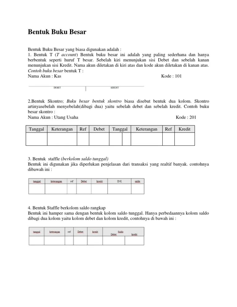 buku besar bentuk t sederhana. 201 tanggal keterangan ref debet tanggal keterangan ref kredit siklus akuntansi jasa 3. contoh buku catatan harian kerja; contoh buku besar perusahaan dagang; Tabel di atas merupakan contoh dari bentuk stafel.
